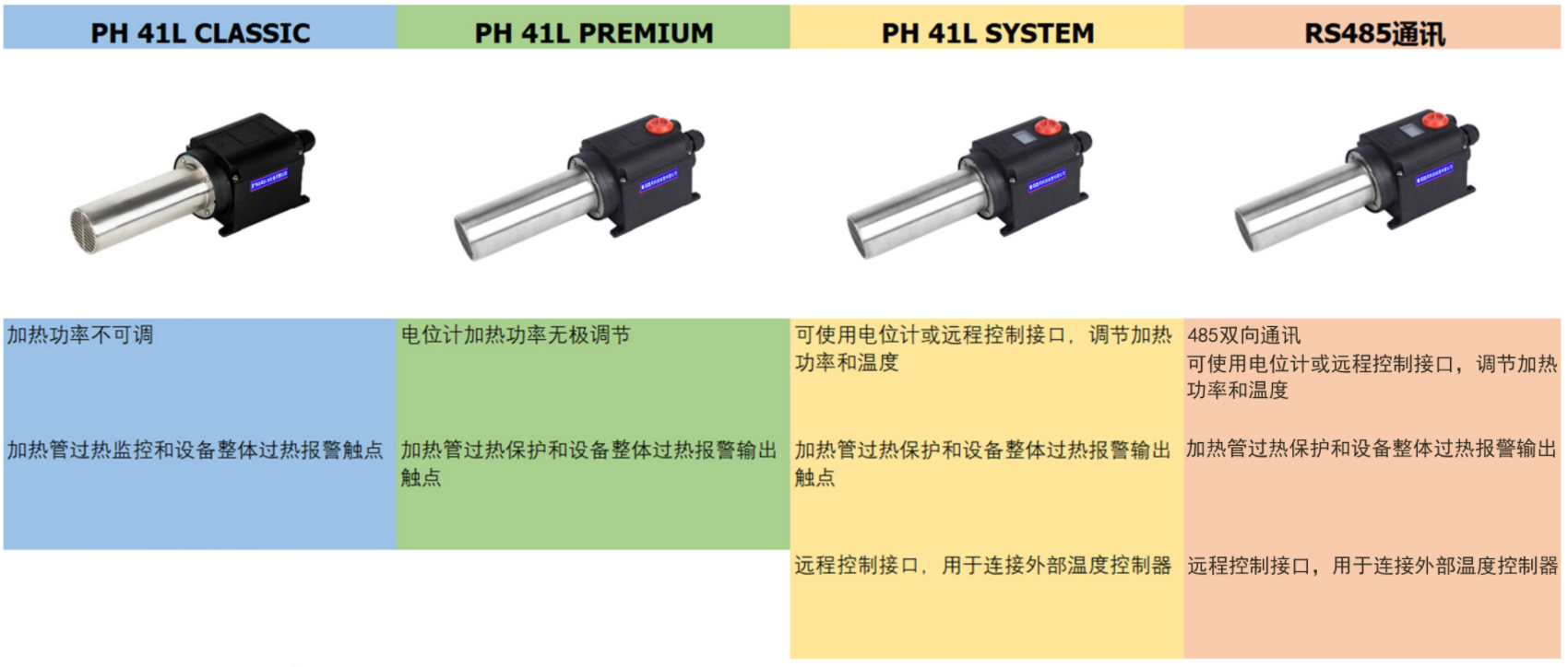 PH 41L系列加热器有4款:基础款、功率调节、数显款和RS485通讯。四款产品可满足客户的不同需求。